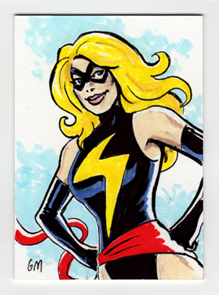 02.26.15 by Greg Ms. Marvel sketchcards Two sketch cards celebrating the brand new Ms. Marvel, Kamala Khan, and her inspiration from 1970s Marvel, Carol Danvers. Experimenting with a mix of markers on extra heavy weight bristol cards.